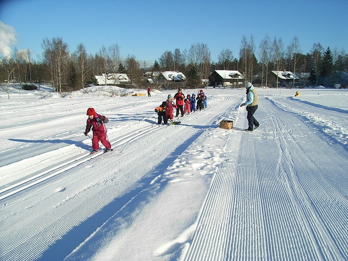 Lapsille opetettiin hiihdon alkeita Muumihiihtokoulussa Perttulan kentällä 10. helmikuuta 2007.