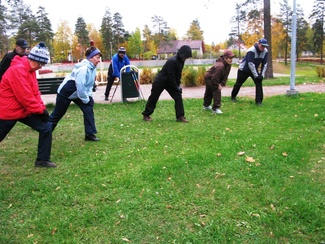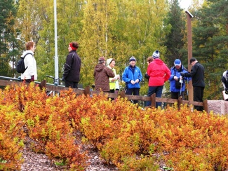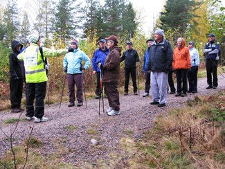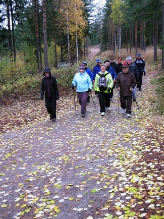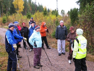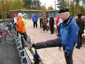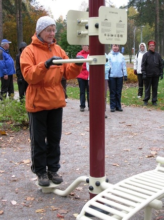 Tiikerinlenkki tutuksi tapahtumissa oli vuorossa Ahdenkallion lenkki. Kokoonnuimme kaupunkisillan uimalan montulle. Vetäjämme Kaarina Moisio perehdytti aluksi väkeä Ahdekallion kuntosalilin laitteisiin. Tällä salillahan seinät ovat leveällä ja katto korkealla, eikä hienhajukaan varmaan ketään häiritse. Maauimalan viereisessä puistikossa on ryhmä hiukan perinteisistä kuntosalilaitteista eroavia kuntolaitteita, joita jokainen ulkoilija voi vapaasti käyttää. Kiersimme tämän alkujumpan jälkeen kävellen Tanssikallion - Ahdekallion lenkin ihastellen syksyisen ruskan värejä.