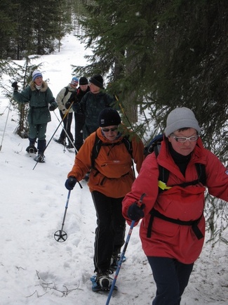 Kauden toinen Hyvinkään Ladun Lumikenkäretki käveltiin pikkupakkasessa ja kevyen lumisateen silloin tällöin meitä ilahduttaessa. Maastossa ei siis hirveästi ollut vielä kevään merkkejä näkyvillä päivämäärästä huolimatta. Retken puheenaiheeksi nousi tavan takaa nivelet ja ylipäätään liikkuminen varttuneemmalla iällä. Joukossamme mukana kulki Tarja, joka mainosti saaneensa uudet 'rautapolvet' vain kaksi kuukautta aiemmin ja pärjäävänsä meidän joukossamme vallan mainiosti. Ja näin kävikin ilmeiseksi sillä niin ripeästi hän selvitti joukossamme Usmin lukuisat nousut ja laskut. Tarjan viesti kaikille kohtalotovereille olikin Tarvan malliin, että eikun ylös, ulos ja lenkille...