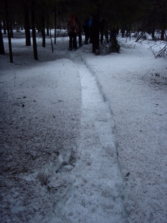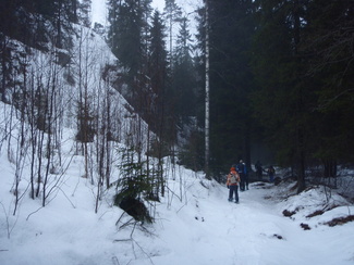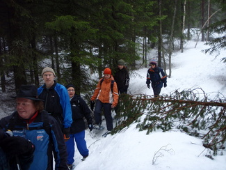 Talven neljäs ja samalla viimeinen lumikenkäretki käveltiin tällä kertaa varsin raskaassa vesikelissä. Lumikenkä upposi paikon jopa puolen metrin syvyiseen märkään, valkeaan massaan. Tässäkin kelissä latulaiset selvittivät vetäjän suunnitteleman reitin hienosti, kunhan vain huomattiin edetä kelin edellyttämällä vauhdilla. Elämyksiä oli nytkin mukavasti tarjolla. Tässä muutamia kuvia reitin varrelta.