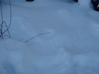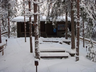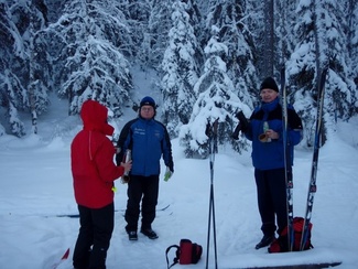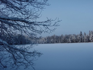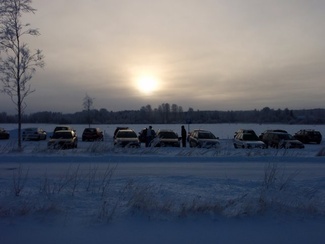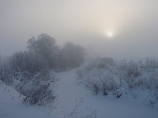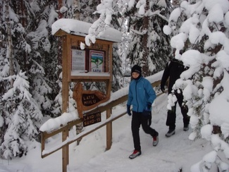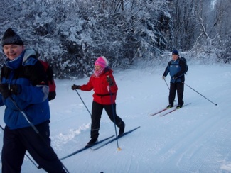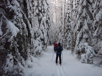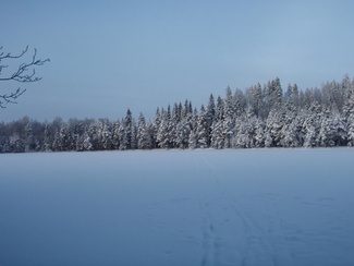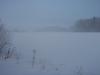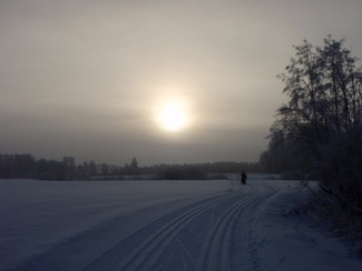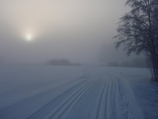 Sunnuntaipäivä 10. tammikuuta valkeni kylmänä ja utuisena. Muutama reipas latulainen uhmasi kuitenkin pakkasherraa ja suuntasi suksenkärjet kohti Kypärälammen maisemia. Kaarina jätti merkiksi enkelin lammen nuotiopaikan tuntumaan. Kameran takana oli Lauri Huhti.