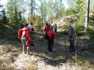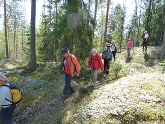 Tämänkertainen Kesänavauspatikka saatiin tarpoa todellakin sangen kesäisissä olosuhteissa; aurinko paistoi täydeltä terältään ja metsässä lämpötila nousi niin korkealle, että t-paidoissakin patikoijat näyttivät tarkenevan vallan hyvin. Latukalenteriimme patikka oli merkitty keski-vaativaksi, mikä osoittautui varsin oikeaan osuneeksi, sillä niin monta terävää nousua Kalevi oli reitillemme löytänyt. Reitti noudatteli viime vuotisia polkuja, eli Latu-Miilusta suunnattiin ensin Paalijoen rannoille, täältä käänyttiin kohti Isoa Karhulampea, jossa syötiin eväät ja lopuksi palattiin Kaksoislampien kautta takaisin Latu-Miiluun. Kameran takana oli jälleen Lauri.