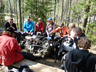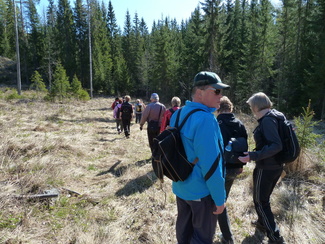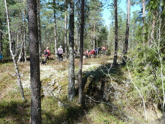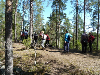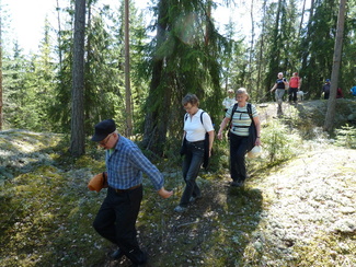Tämänkertainen Kesänavauspatikka saatiin tarpoa todellakin sangen kesäisissä olosuhteissa; aurinko paistoi täydeltä terältään ja metsässä lämpötila nousi niin korkealle, että t-paidoissakin patikoijat näyttivät tarkenevan vallan hyvin. Latukalenteriimme patikka oli merkitty keski-vaativaksi, mikä osoittautui varsin oikeaan osuneeksi, sillä niin monta terävää nousua Kalevi oli reitillemme löytänyt. Reitti noudatteli viime vuotisia polkuja, eli Latu-Miilusta suunnattiin ensin Paalijoen rannoille, täältä käänyttiin kohti Isoa Karhulampea, jossa syötiin eväät ja lopuksi palattiin Kaksoislampien kautta takaisin Latu-Miiluun. Kameran takana oli jälleen Lauri.