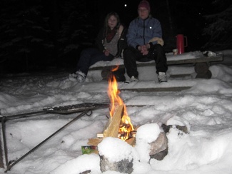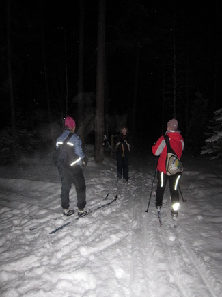 Retkikalenterissa oli vuorossa kuutamohiihto. Täydenkuun aika osui lauantai-illaksi, eikä säidenhaltijakaan ollut erityisen suosiollisella tuulella. Siksipä retkelle oli uskaltautunut ainoastaan neljä innokasta hiihtäjää. Hiihtelimme hämyisessä illassa Iso-Kypärälammen nuotiopaikalle, jonne virittelimme tulet. Paluumatkalla se kuukin sitten pilkisti pilviverhon takaa salaperäisesti.