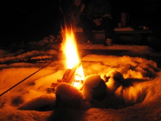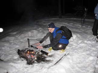 Retkikalenterissa oli vuorossa kuutamohiihto. Täydenkuun aika osui lauantai-illaksi, eikä säidenhaltijakaan ollut erityisen suosiollisella tuulella. Siksipä retkelle oli uskaltautunut ainoastaan neljä innokasta hiihtäjää. Hiihtelimme hämyisessä illassa Iso-Kypärälammen nuotiopaikalle, jonne virittelimme tulet. Paluumatkalla se kuukin sitten pilkisti pilviverhon takaa salaperäisesti.