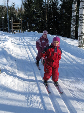 Muumihiihtokoulun toinen hiihtopäivä valkeni kireähkössä pakkasessa. Päätimme kuitenkin, että lähdetään ainakin katsomaan, josko siella suksi edes vähän luistaisi. Hiihtokoululaisia ilmestyikin paikanpäälle yhdeksän, joten laitoimme koulun pystyyn. Harjoittelimme sekä tasamaahiihtoa että mäenlaskua. Pikku ryhmän kanssa kävimme katselemassa metsässä jäniksen- ja ketunjälkiä. Oheiset kuvat ovat Heikki Moision ottamia.