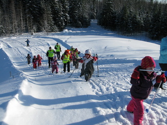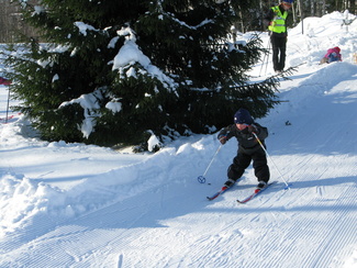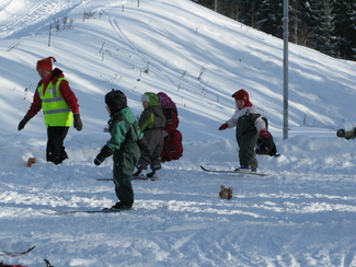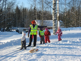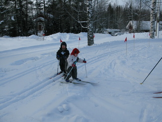 Muumihiihtokoulun toinen hiihtopäivä valkeni kireähkössä pakkasessa. Päätimme kuitenkin, että lähdetään ainakin katsomaan, josko siella suksi edes vähän luistaisi. Hiihtokoululaisia ilmestyikin paikanpäälle yhdeksän, joten laitoimme koulun pystyyn. Harjoittelimme sekä tasamaahiihtoa että mäenlaskua. Pikku ryhmän kanssa kävimme katselemassa metsässä jäniksen- ja ketunjälkiä. Oheiset kuvat ovat Heikki Moision ottamia.