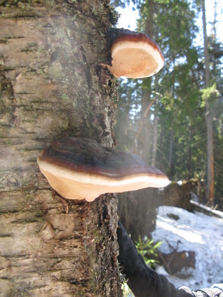 Kuusenjuurikääpä eli maannousemasieni lahottaa kuusia. Se ei varsinaisti tapa puuta, mutta aiheuttaa sen lahoamisen sisältäpäin. Seurauksena saattaa olla puun katkeaminen myrskyssä vaikka latvus olisi vielä elinvoimaisen näköinen.Tämä kuusi oli kylläkin kelottunut ennen katkeamistaan, mutta oli näköjään tyvestään laho.