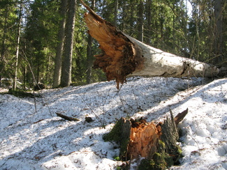 Kuusenjuurikääpä eli maannousemasieni lahottaa kuusia. Se ei varsinaisti tapa puuta, mutta aiheuttaa sen lahoamisen sisältäpäin. Seurauksena saattaa olla puun katkeaminen myrskyssä vaikka latvus olisi vielä elinvoimaisen näköinen.Tämä kuusi oli kylläkin kelottunut ennen katkeamistaan, mutta oli näköjään tyvestään laho.