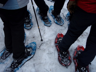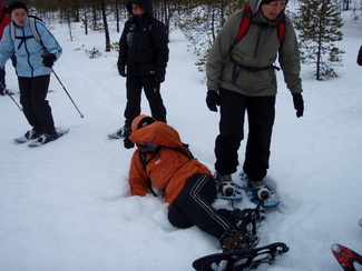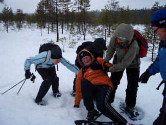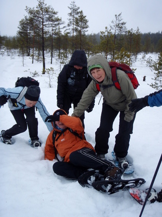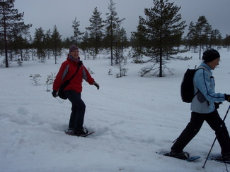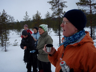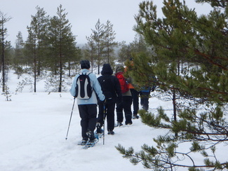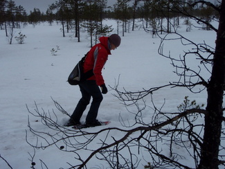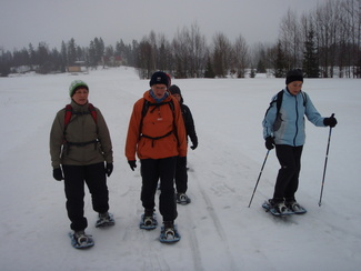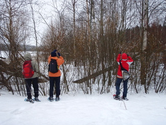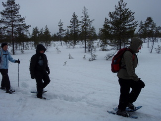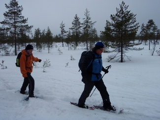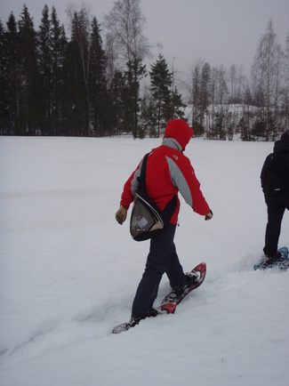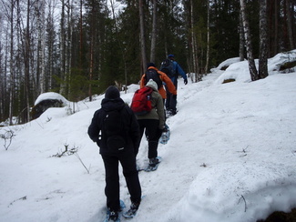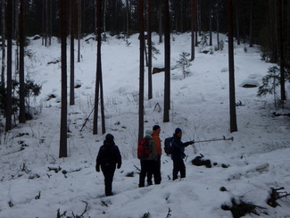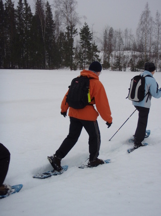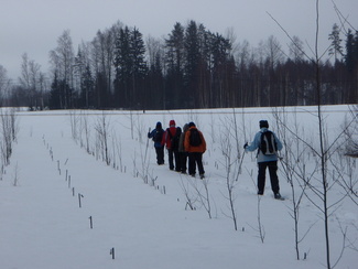 Hyvinkään Ladun retki Petkelsuolle suoritettiin tällä kertaa lumikengillä, sillä huhtikuun alkupuolen lumet riittivät vielä peittämään niin pellot kuin pientareetkin. Lämpötila oli jo aamu kahdeksalta plussan puolella eli tuo lumikenkä olikin latulaisen luonnollinen valinta etenemisvälineeksi. Edeltävän vuorokauden ajoittainen vesisade ei vielä ollut ennättänyt kastella lumipeitettä läpeensä, joten kantavuus todettiin Palstojentien varressa yllättävänkin hyväksi. Karvan harmaassa aamussa mukaan matkalle lähti seitsemän kenkäilijää. Tämä natsasi sangen hyvin reittisuunnitelman kanssa, kuljettiinhan osa matkasta Seitsemän Veljeksen merkittyä reittiä. Kuvat tallensi ja tekstin naputteli Lauri.