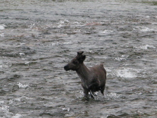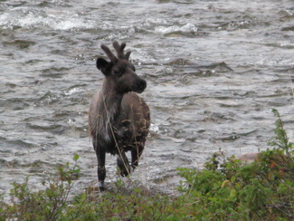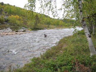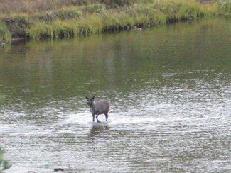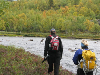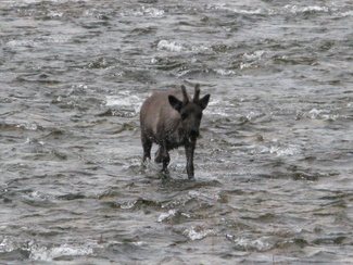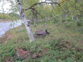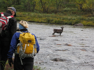 Eräänä aamuna, kulkiessamme jokivartta pitkin kohti tuntureita saimme seuraksemme nuoren poron. Eläimen käytös oudoksutti meitä, sillä se juoksi perässämme tulematta pois vedestä. Kun pysähdyimme poro tuli aivan lähelle, ja koukkasi sillä kohtaa maihin. Nulkkasi siinä tyynesti meidän ohitsemme ja hyppäsi taas jokeen juoksemaan. Pian se kuitenkin kyllästyi meihin ja noustuaan vastarannalle katosi tunturikoivikkoon. Liekö ollut niin, että nuori yksilö oli eksynyt omasta joukostaan ja luuli raitoamme omaksi väekseen. Näimme seuraavana päivänä varmaankin tuon saman yksilön. Silloin se oli jo löytänyt muutaman lajikumppanin, joiden seurassa se käyskenteli.