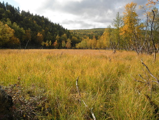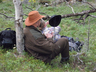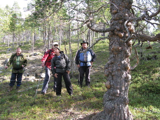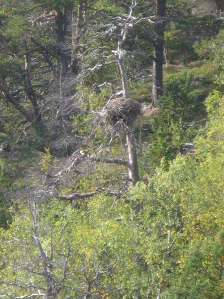 ...nimittäin maakotkan pesä puron toisella puolella! Matkaa pesälle oli tästä paikasta useampi sata metriä. Kotkaa emme nähneet, emmekä olisi halunneetkaan rauhoitettua lintua millään tavoin häiritä. Maakotkan pesäpuun ympäristössä on muutenkin suoja-alue, jonne ei ole lupa mennä linnun pesimäaikana.