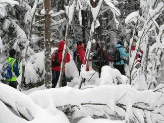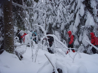 Kuvaa tarkemmin katsoessa havaitaan, että olihan meidän joukossa sentään yksi hiihtovälineinkin matkaan lähtenyt. Sipoonkorpi tuntui olevan oikeasti sakeaa korpimetsää ainakin länsireunaltaan, joten talvisaikaan lumikengät ovat ehdottomasti parhaimmat välineet kansallispuiston luontoon tutustuttaessa.