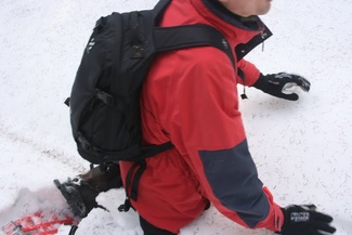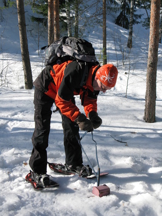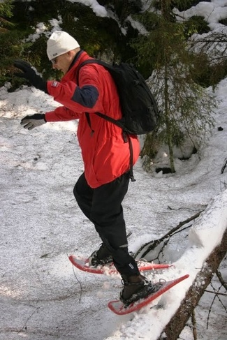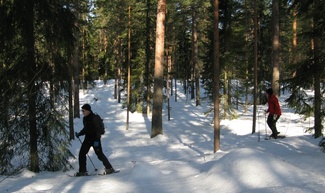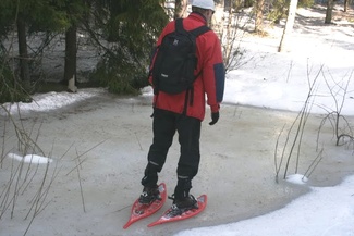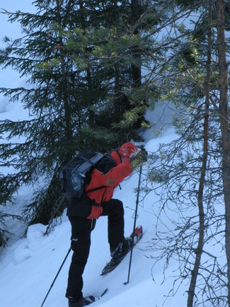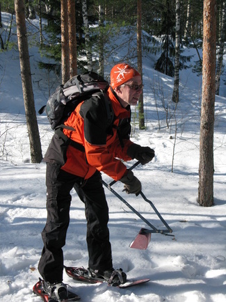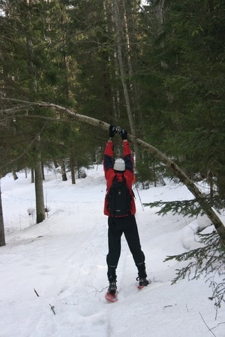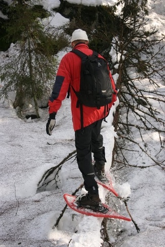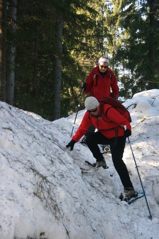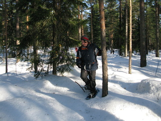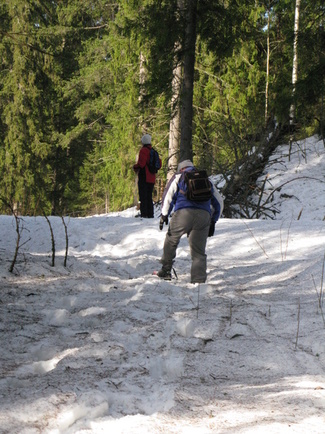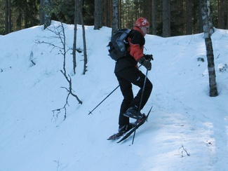 Metsässä liikuttaessa tulee tietenkin ylä- ja alamäkiä. Lumikenkäilijä selviää niistä suksimiestä ja -naista helpommin!