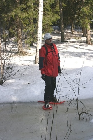 Sonninmäessä päästiin lumikenkäilemään mainiossa kevätsäässä. Hankikantoa oli jonkin verran, mutta ei kuitenkaan joka paikassa.