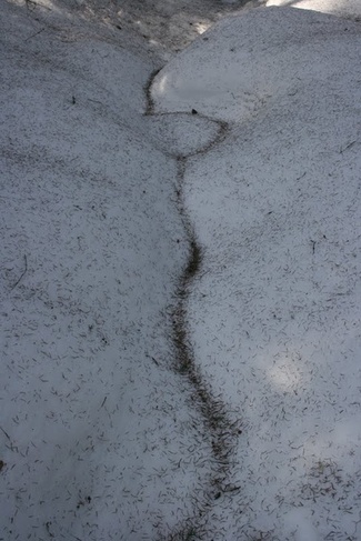 Hangelle kertyy keväällä havunneulasia ja muuta roskaa. Eivätpä nuo lumikenkäilijää haittaa, päinvastoin. Luontoäiti muotoilee niistä mukavanlaisia kuvioita.