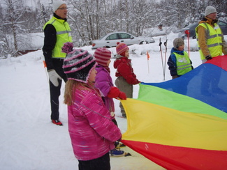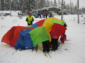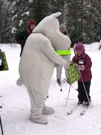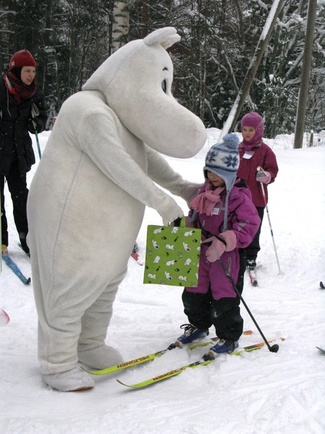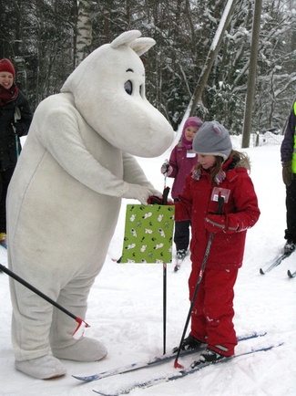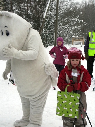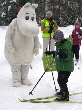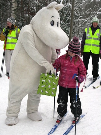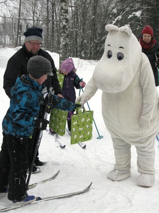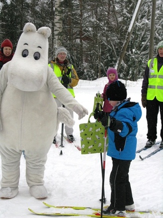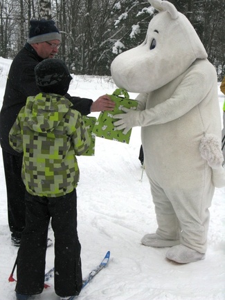 Hiihtokoulun päätöksessä ystävämme oli tietenkin mukana jakaen kullekkin oppilaalle Muumikassin ja todistukset.