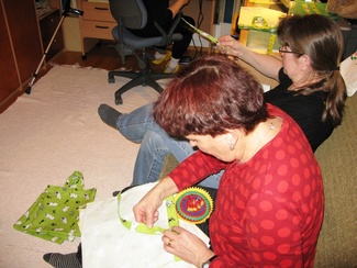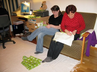 Muumihiihtokoululaiset saivat koulusa päätteeksi todistuksen muumikankaisessa kassissa. Eiväthän ne kassit ihan tyhjästä syntyneet, vaan Seija, Liisa ja Kaarina ahkeroivat pari iltaa niiden kimpussa...