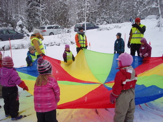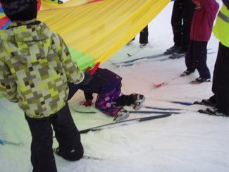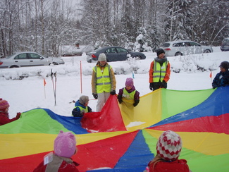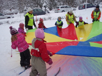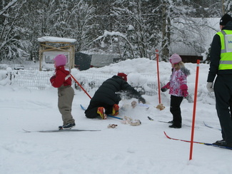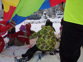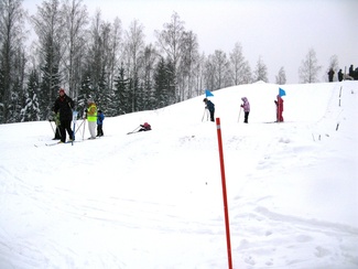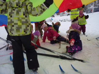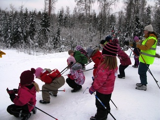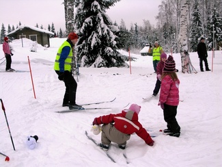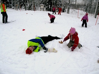 Tauon jälkeen kipaistiin mäen päälle. Sukset jätettiin pois, mutta mäenlaskuasentoa harjoiteltiin sauvojen kanssa.