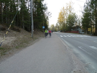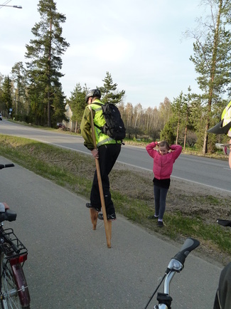 Paluumatkalla tyttönen harjoitteli puujaloilla kävelemistä pyörätiellä. Meidän urhot lainasivat vähän noita sirkusvälineitä kokeillakseen, miltä se nuoruus tuntuikaan. Hyvinkään Ladun retkikalenteriin päätettiin samantien ottaa lajiksi puujalkakävely.....! No, myönnetään, että on niitä puujalkoja ollut tähänkin asti retkillämme mukana! Tervetuloa vastakin!