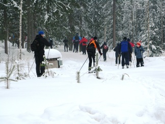 Hyvinkään ympärihiihto hiideltiin Lauri Huhdin vetämänä. Eikä Lauri tosiaankaan tarvinnut tälläkertaa lähteä yksin matkaan, sillä osallistujija oli tullut mukavasti retkelle. Järvenpään Ladun tehoryhmä vahvisti tuntuvasti taas omia joukkojamme. Hyvinkään ABC:ltä lähtenyt ja sinne päättynyt ympyräretki hiihdeltiin mukavassa talvisäässä. Lämpötila oli karvan verran miinuksen puolella. Kuvia näpsi Sulo Simonen ja Lehtolan ulkoilumajalla muumihiihtelyissä ollut Timo Tuomainen.