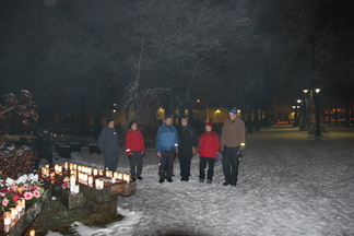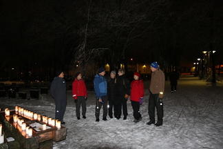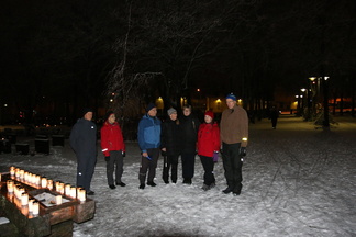 Itsenäisyyspäivän iltakävelylle lähdettiin seitsemän hengen joukolla. Rautatieläisten hautuumaan kautta suunnistettiin Sandelininpuistoon ja kirkonmäelle. Katselimme Hämeenkadun ja Uudenmaankadun jouluvaloja matkalla Puolimatkan hautausmaalle. Puolimatkassa sytytimme muistokynttilät Karjalaan jääneiden muistomerkille ja muistolehdon paadelle. Kuvat näpsi Timppa