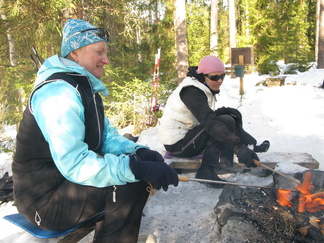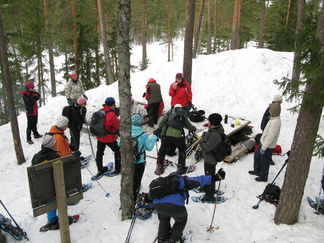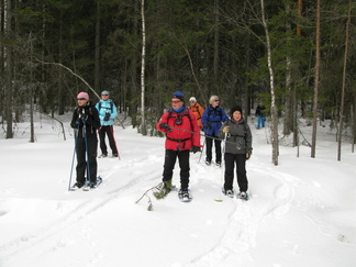 Maaliskuu on mainiota aikaa lumikenkäilyyn. Siksipä retkikalenterissamme lumikenkäilyt ovatkin loppukeväästä, kun laduilla tuppaa olemaan jo tuulten puista puhaltamaa roskaa. Keväämmällä myös ainakin aamupäivisin hanki kantaa yöpakkasten ansiosta lumikenkäilijää paremmin kuin keskitalvella. Erinomainen oli säätila tälläkin retkellä, kun kenkäilimme Usmin uimarannan P-paikalta Latu-Miiluun ja takaisin. Eikä matkareittimme tosiaankaan ollut viivasuora, vaan se kierteli kurujen, kallioiden ja lampien kautta. Matkaan läksi mukavasti väkeä ja aikaa noin kahdeksan kilometrin mittaiseen retkeemme kului noin 3,5 tuntia. Kuvat otti Timo Tuomainen
