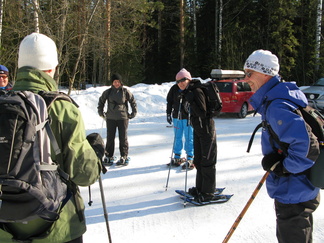 Maaliskuu on mainiota aikaa lumikenkäilyyn. Siksipä retkikalenterissamme lumikenkäilyt ovatkin loppukeväästä, kun laduilla tuppaa olemaan jo tuulten puista puhaltamaa roskaa. Keväämmällä myös ainakin aamupäivisin hanki kantaa yöpakkasten ansiosta lumikenkäilijää paremmin kuin keskitalvella. Erinomainen oli säätila tälläkin retkellä, kun kenkäilimme Usmin uimarannan P-paikalta Latu-Miiluun ja takaisin. Eikä matkareittimme tosiaankaan ollut viivasuora, vaan se kierteli kurujen, kallioiden ja lampien kautta. Matkaan läksi mukavasti väkeä ja aikaa noin kahdeksan kilometrin mittaiseen retkeemme kului noin 3,5 tuntia. Kuvat otti Timo Tuomainen