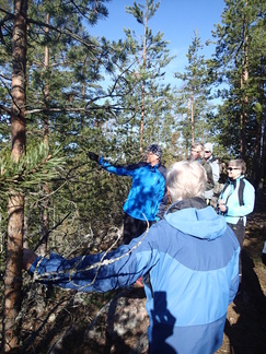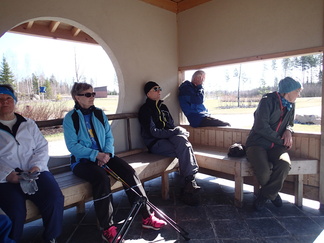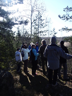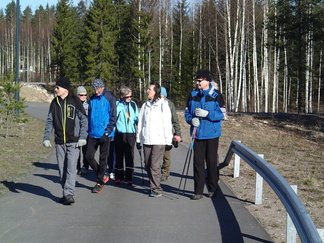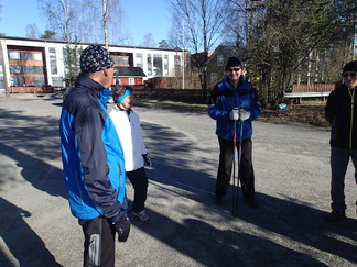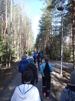 Kokoonnuimme Kirjavantolpan Alepan parkkipaikalle kymmenen hengen voimin ja lähdimme kävelemään Timon opastuksella kohti entistä asuntomessualuetta Kravunarkunmäellä. Säänhaltija oli varannut meille aurinkoisen ilman, mutta sen verran koleaa vielä oli, ettei takkia tohtinut riisua vaikka hanskoista joku luopuikin reitin varrella. Kävely kesti tällä kertaa sellaiset tunti viisikymmentä minuuttia. Kuvat nappasi tällä Lauri.