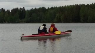 Matka taittui mukavasti ja tuulikin jossain vaiheessa keinutti mukavasti, muttei liikaa. Pieni huilitauko pidettiin matkalla. Rannoilla oli paljon kesämökkejä ja hiukan hulppeammankin näköistä asumusta. Kalliomaisemaa ja hiekkarantaa oli vaihtelevasti. Luonto oli jo nyt täydessä vauhdissa, niin vehreää rannoilla oli.