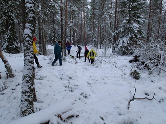 Karhulta metsän poikki reitille ja taas oikaisu notkon kautta ja niin olimme perillä Latu-Miilussa. Metsä oli hienossa lumipeitteessä, lunta oli maassa ja puussa. Ensi viikolla todennäköisesti kaikki taas katoaa sateisiin (vesi-?). Kerkesimme nauttia lumisesta maisemasta juuri sopivasti. Mutta sitähän tulee ajallaan taas lisää ja ehkä ne lammetkin vielä jäätyvät kantaviksi, ja riittävästi kun tulee lunta, niin pääsemme hiihtasemaankin, - muuallekin kuin Perttulaan.