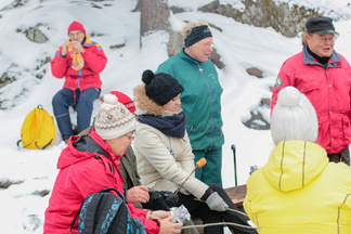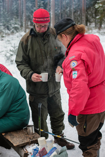 Isänpäivän patikan lähtöpaikalle Latu-Miiluun kerääntyi yhteensä 27 lähtijää. Järvenpään Latu oli parhaiten edustettuna, sitten Hyvinkää, Keravalta ja Riihimäeltä yksi molemmista. Timo huomasi että Suomen lippu pitänee nostaa salkoon isänpäivän kunniaksi, näin tehtiin ja oli siis juhlava lähtö.