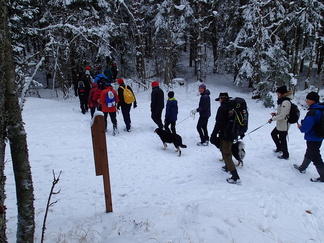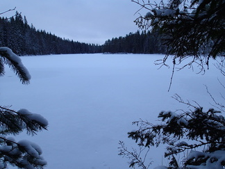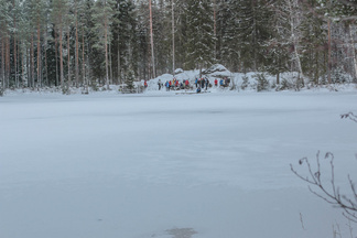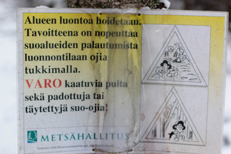 Taivalsimme lumista tietä Kypärän suuntaan, aina Piilon tien risteykseen asti, autonjäljet olivat tampanneet hyvän kulkualustan. Piilontieltä oikaisimme suoraan Metsähallituksen soidenennallistamistöiden runnomaa notkelmaa (hieno korpimaisema) Piilolammen pohjois-päähän. Kiersimme lammen eteläpään nuotiopaikalle tulistelemaan. Ilmeisesti Joulupukki oli toimittanut paikalle pahvilaatikossa puita, mukanamme kantamien lisäksi. Kelpasi niitä poltella, kahvit kiehuivat ja makkarat mustuivat, hyviltä maistuivat, kuten myös Sinikan piirakka.