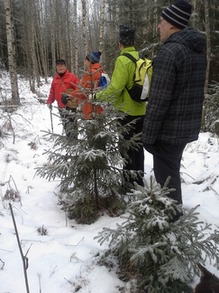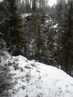Muuntajan jälkeen päätimme “oikaista” vanhan louhoskallion kautta Hyyppäräntielle. Maastossa oli tosi paljon kaatunutta puuta ja muuta estettä, tulihan nähtyä jyrkkiä kallioita ja mm kumpare jossa oli useita pesäkolojen suuaukkoja. Muutama vuosi taaksepäin oli kumpareella ulostekasoja, ilmeisesti mäyrä oli käyttänyt koloja pesänään, nyt ei näkynyt asumisen merkkejä. Mukanamme ollut koira oli oikeinkin kiinnostunut kolojen hajuista.