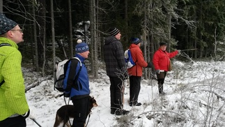 L-M: ssa lämmitimme kuumat glögit ja kaivoimme vielä kaapista pikkujouluista jääneet piparitkin pöytään. Paluureitti suuntautui Aarinnansuon ulkoilureittiä ja edelleen polku-uria vanhalle muuntajalle.