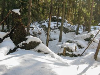 Kauniina, aurinkoisena sunnuntaina lähdimme lumikenkäilemään Usmiin. Aleksis Kivenkadun P-paikalle kokoontui 14 hengen porukka, yhtä siinä vielä kaipailimme. Hänelle oli tainnut uni tehdä tepposet, emme ryhtyneet herättämään. Täytimme autot ja jätimme ylimääräiset ajoneuvot parkkiin odottamaan paluuta. Ajoimme Hyyppärän “peltoparkkiin” ja sovittelimme kengät jalkaan. Seurasi lyhyt info jonka jälkeen lähdimme matkaan. Hyyppäräntien ylitys sujui tyylikkäästi avorivissä. Romuttamon ja maneesin välistä oikaisimme metsään ja louhoksen kivikasoja kierrellen kohti Niemisen niityn kulmaa. Otimme hiukan aurinkoa ennen nousua mäen harjanteelle, josta etenimme kohti Karhulammen vesiputousta. Oikaisimme suon poikki Iso-Karhulle pitämään taukoa nuotiopaikalle. Tulet olivatkin jo tehty ja nuotio paloi, joten meidän mukanamme tuomat puut säästyivät. Nuotiolle oli saapunut meitä ennen kaksi porukkaa, mieshenkilö kahden ulkomaalaistaustaisen nuorukaisen kanssa sekä perhe, jossa oli vanhemmat ja viisi pientä tenavaa. Heillä oli oikea asenne ulkoiluun. Isä lämmitti jauhelihapihvejä nuotiolla, äiti hoiti muuta ruoka- ym. huoltoa ja muksut laskettelivat pulkalla mäkeä. Näyttivät viihtyvän, eikä siihen tarvittu kalliita vermeitä, kun pulkka riitti hauskanpitoon. Nuotiolta oioimme kohti Latu-Miilua, jossa Jukka hoiti majaa. Tauon jälkeen nousimme taas mäkeä ylös ja suuntasimme Erämatkojen vaijerille, sen alapäähän tällä kertaa. Sieltä kenkäilimme alas Aarinnansuolle ihmettelemään paannejäämuodostelmaa. Aarinnansuota kävelimme ulkoilureittiä pitkin, kohti etelää. Iso-Karhun risteyksen jälkeen nousimme taas “Kalliomäelle”, mäen yli kohti Hyyppärää. Jatkoimme aurinkoista hakkuualueen reunaa alas louhoksien välisiä polkuja kohti tulojälkiämme ja pian olimmekin jo peltoparkissa. “Releet”purkuun päinvastaisessa järjestyksessä ja ajo Aleksis Kivenkadulle. Aikaakin kului rapiat 4 tuntia ja aurinkokin lopetti paistamisen viime metreillä. Kilometrejäkin tuli, ehkä n. 7-8. Ehkä jollakin retkeläisellä oli mukanaan Gps, mutta matkan pituus jäi häneltä tarkistamatta. Kuvat näppäili Timppa.