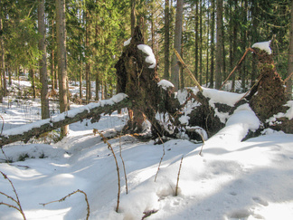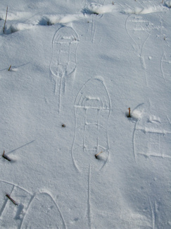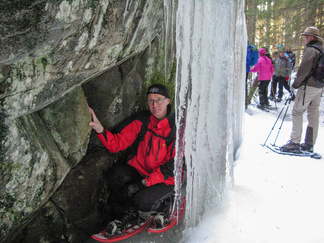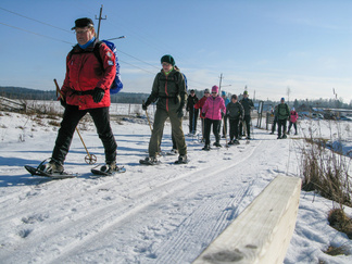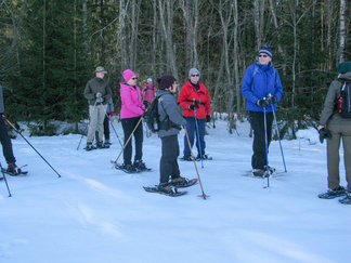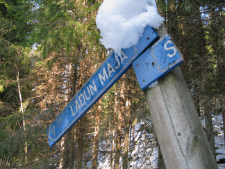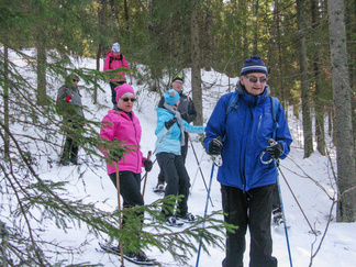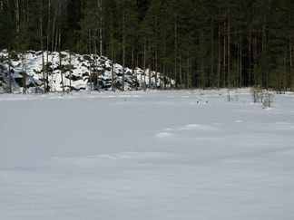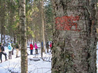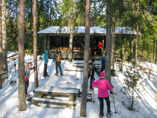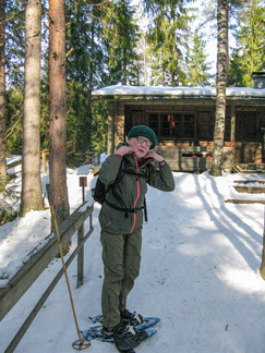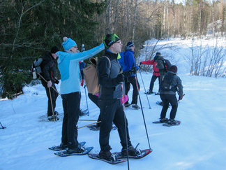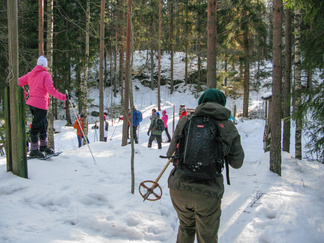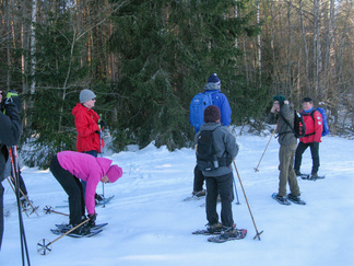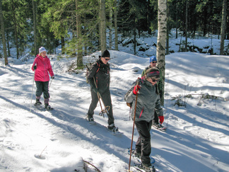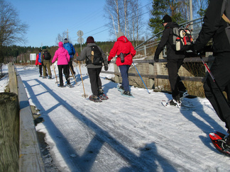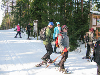 Kauniina, aurinkoisena sunnuntaina lähdimme lumikenkäilemään Usmiin. Aleksis Kivenkadun P-paikalle kokoontui 14 hengen porukka, yhtä siinä vielä kaipailimme. Hänelle oli tainnut uni tehdä tepposet, emme ryhtyneet herättämään. Täytimme autot ja jätimme ylimääräiset ajoneuvot parkkiin odottamaan paluuta. Ajoimme Hyyppärän “peltoparkkiin” ja sovittelimme kengät jalkaan. Seurasi lyhyt info jonka jälkeen lähdimme matkaan. Hyyppäräntien ylitys sujui tyylikkäästi avorivissä. Romuttamon ja maneesin välistä oikaisimme metsään ja louhoksen kivikasoja kierrellen kohti Niemisen niityn kulmaa. Otimme hiukan aurinkoa ennen nousua mäen harjanteelle, josta etenimme kohti Karhulammen vesiputousta. Oikaisimme suon poikki Iso-Karhulle pitämään taukoa nuotiopaikalle. Tulet olivatkin jo tehty ja nuotio paloi, joten meidän mukanamme tuomat puut säästyivät. Nuotiolle oli saapunut meitä ennen kaksi porukkaa, mieshenkilö kahden ulkomaalaistaustaisen nuorukaisen kanssa sekä perhe, jossa oli vanhemmat ja viisi pientä tenavaa. Heillä oli oikea asenne ulkoiluun. Isä lämmitti jauhelihapihvejä nuotiolla, äiti hoiti muuta ruoka- ym. huoltoa ja muksut laskettelivat pulkalla mäkeä. Näyttivät viihtyvän, eikä siihen tarvittu kalliita vermeitä, kun pulkka riitti hauskanpitoon. Nuotiolta oioimme kohti Latu-Miilua, jossa Jukka hoiti majaa. Tauon jälkeen nousimme taas mäkeä ylös ja suuntasimme Erämatkojen vaijerille, sen alapäähän tällä kertaa. Sieltä kenkäilimme alas Aarinnansuolle ihmettelemään paannejäämuodostelmaa. Aarinnansuota kävelimme ulkoilureittiä pitkin, kohti etelää. Iso-Karhun risteyksen jälkeen nousimme taas “Kalliomäelle”, mäen yli kohti Hyyppärää. Jatkoimme aurinkoista hakkuualueen reunaa alas louhoksien välisiä polkuja kohti tulojälkiämme ja pian olimmekin jo peltoparkissa. “Releet”purkuun päinvastaisessa järjestyksessä ja ajo Aleksis Kivenkadulle. Aikaakin kului rapiat 4 tuntia ja aurinkokin lopetti paistamisen viime metreillä. Kilometrejäkin tuli, ehkä n. 7-8. Ehkä jollakin retkeläisellä oli mukanaan Gps, mutta matkan pituus jäi häneltä tarkistamatta. Kuvat näppäili Timppa.
