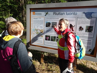 Tämänpäiväinen pyöräretki onnistui niin säätilan kuin pyöräilijöiden kunnonkin puolesta hyvin! Meitä kokoontui Aleksiskiven kadun parkkipaikalle 6 pyöräilijää.Suunnistimme pääasiassa pikkuteitä pitkin kohti Riuttaa.Tutustuimme ensin Ilves-ja luontopolun opastauluun.