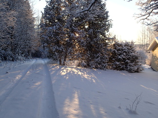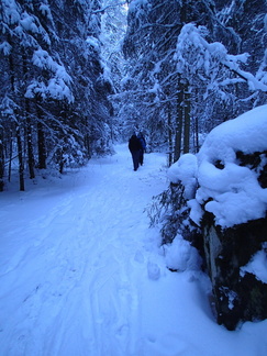 Kävelimme Hyyppäräntietä Usminjärventielle mistä poikkesimme kuusiaidan loputtua maastoon vanhalle louhostielle ja edelleen Niemisen niityn kautta kohti Aarinnansuon reittiä. Ennen Aarinnansuota jatkoimme ulkoilureittiä Karhulammen suuntaan ja edelleen Kaksoislammen laavulle metsän poikki. Lumi oli huokoista eikä isommin kulkua haitannut. Kaksoislammilla poikkesimme jäälle, jossa oli yllättäen eniten lunta. Jatkoimme edelleen Usmintielle ja Latu-Miiluun tauolle, jossa Jukka hoiti tarjoilun. Tauon jälkeen Aarinnansuon reittiä takaisin omille jäljille ja Hyyppärään. Kuvat reitin varrrelta tallentuivat Laurin kameraan.