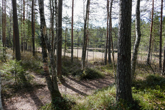 Usmintien ylityksen jälkeen lähdimme nousemaan kohti lounasta kalliomäkien yli Aarinnansuon eteläpäähän. Sieltä ulkoilureittiä (mustankiven kierros) kohti Karhulampea. Kaupunki oli jo lumiaikaan vetänyt lehtikuusilankkuja reitin varrelle. Nyt niistä oli aloitettu tehdä uusia lankutuksia reitin märempiin kohtiin. Tulee hyvännäköinen lankutus.