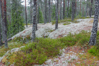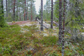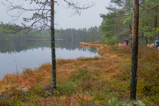 Matka jatkui huimalla laskulla alas rantaan köyteen tukeutuen ja edelleen rannan louhosta sivuten puroksi muuttunutta polkua ylös mäkeen, missä myös oli köysi apuna, ja edelleen kohti Usminrinteentietä ja Kaksoislammen taukopaikkaa. Polun ja tien risteyksessä katsastimme metsähallituksen ennallistamiskohdetta ja totesimme sen vihdoin tulleen siihen tilaan mikä on ollut tarkoituksenakin. Vesi seisoi paikallaan ja puut olivat kuolleet pystyyn.