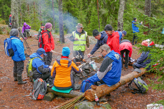 Matkasimme kohti Kypärälampea, jonka ohitimme kosteikot kiertäen rinteeseen nousten ja poikkesimme Riihimäen partiolaisten majan pihapiirissä. Siellä huomasimme, että kaikki alueen majat ovat ympäristöään korkeammalla, ja ovat siten valmistautuneet hyvin ilmastonmuutokseen sekä tulevaan vedenpaisumukseen. Sieltä laskeuduimme alas rantaan ja edelleen ”Suolijärventie rengastien” kautta Usminrinteentielle. Jatkoimme edelleen yläpolkua Piilon pohjoispään nuotiopaikalle pannua ja makkaroita nokeamaan. Kaffet keitettiin järviveteen, hyvää tuli ja kaikille riitti, makkaroitakin kului.