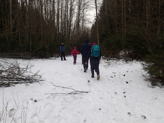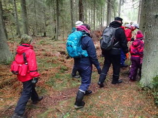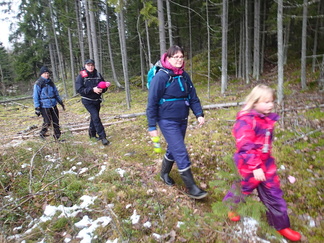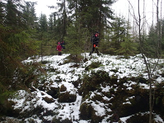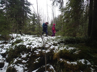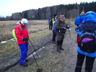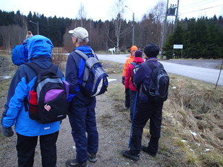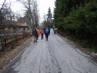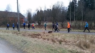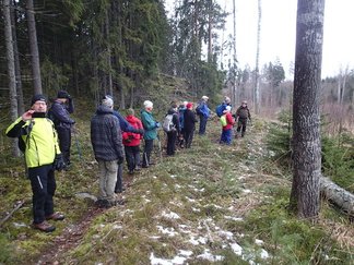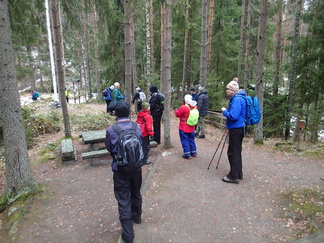 Metsään mentiin, Pirkko aikanaan sanoi että ”Kalevin kanssa kun lähtee matkaan niin aina päätyy metsään”, niin nytkin. Vauhtia tosin otettiin Hyyppäräntien hevostallien P-paikalta alkumatka liukastellen yön pakkasten liukastamaa ulkoilutietä. Oli yllättäen kuivahko pilvipoutainen sää sadepäivien ja yön pikkupakkasten jälkeen. Matkaan meitä lähti 18 henkeä, miehiä ja naisia, yksi ”alaikäinenkin” joukossa.
