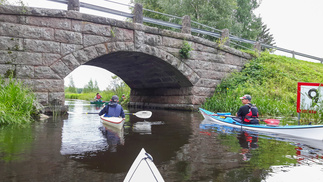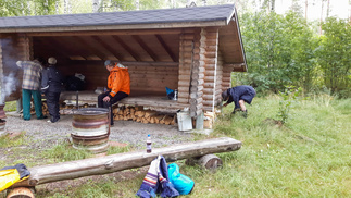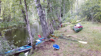 Reitiksi oli valittu Kernaalanjärvi-Räikälänjoki-Kuotolanjärvi-Viralanjärvi ja edelleen Koskenjokea n. 1 km, Sieltä löytyi kyläyhdistyksen EU rahoitusta rakentamiseen saanut hieno laavu kahdella tulipaikalla. Rantautuminen oli hieman erikoista, kun rantapenkka oli korkeahko. Onneksi rannassa kasvoi useita koivuja, joihin tukeutuen pääsi hyvinkin ylös. Omat varatut puut jäivät tietysti autoon, mutta käytimme ”talon puita”. Hyvin paloivat ja nokesivat makkaramme.