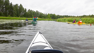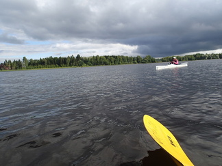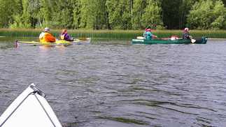 Reitti oli valittu luvatun lounatuulen vuoksi, olisimme hyvin rannan suojassa mennen tullen. Mutta kelihän oli mitä parhain. Ainoastaan lähtörannassa yritti hieman tihuuttaa, mutta lopetti hetimiten, Viralanjärvelle tullessa oli järvi hieman ”rypyssä”, muuten erinomainen melontasää. Kalustona meillä oli 1 x C2 (avokanootti), 1 x K2 kajakki ja 3 x K1 kajakkia.