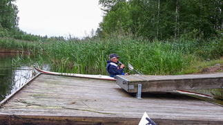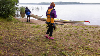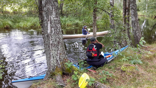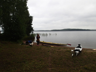 Reitiksi oli valittu Kernaalanjärvi-Räikälänjoki-Kuotolanjärvi-Viralanjärvi ja edelleen Koskenjokea n. 1 km, Sieltä löytyi kyläyhdistyksen EU rahoitusta rakentamiseen saanut hieno laavu kahdella tulipaikalla. Rantautuminen oli hieman erikoista, kun rantapenkka oli korkeahko. Onneksi rannassa kasvoi useita koivuja, joihin tukeutuen pääsi hyvinkin ylös. Omat varatut puut jäivät tietysti autoon, mutta käytimme ”talon puita”. Hyvin paloivat ja nokesivat makkaramme.