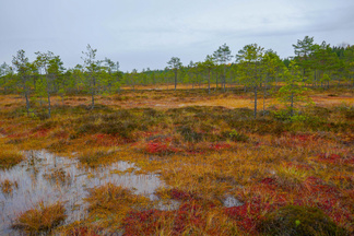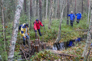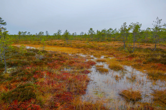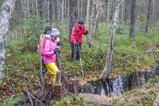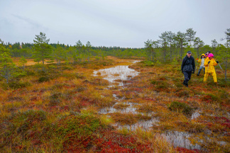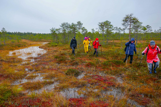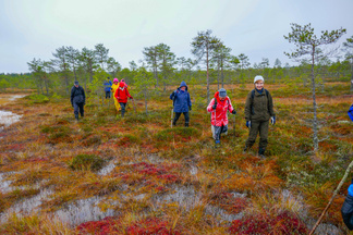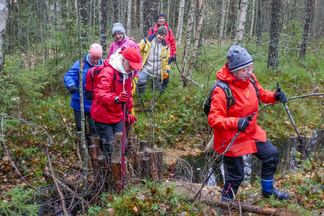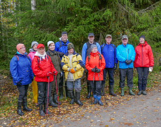 Hyvinkään Ladun ja - Nivelpiirin retki Petkelsuolle tehtiin kahdentoista ulkoilijan joukkueella. Kokoonnuimme Puolimatkan koululla retkeä varten, ja matkasimme sieltä ensin kimppakyydein Rauhalaan autoilla. Onneksi joukko oli aavistanut säätypin oikein ja varustus oli kaikilla asianmukainen. Kumisaappaiden varren pituuskin oli merkittävä seikka, kun astelimme runsaiden sateiden vetistämälle suolle. Suon reunassa kulkevan ojan ylitys onnistui ainoastaan patorakennelmien kohdalla ja itse suolla vesi lienee noussut normaalista korkeudestaan useamman kymmensenttisen. Käväisimme suon itälaidalla olevilla allikoilla ja totesimme, ettei jokaisen lampareen rannoille ole menemistä, kuten aikaisempina syksyinä. Ihastelimme maaruskaa sammaleissa ja lehtiruskaa tienoon koivuissa ja haapapuissa. Karpaloita vaikutti olevan tänä syksynä edellisvuotta enemmän. Karpalot eivät kuitenkaan tuntuneet olevan vielä kypsiä. Lieneekö syynä syksyn vähäisten aurinkoisten päivien määrä. Retkellämme vierähti aikaa kolmisen tuntia ja osallistujat tuntuivat olevan retkeemme tyytyväisiä, vaikka säätila ei ollutkaan kovin hempeä.