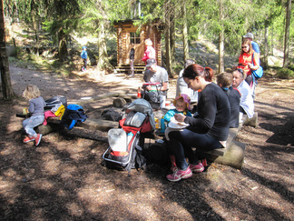 Pienen juomatauon jälkeen jatkoimme kalliopolkua kohti Piilolta tulevaa latu-uraa. Matkalla kehuimme kaupungin uusia opasteita, jotka olisivat tarpeen tuleville retkeilijöille. Laskeuduimme jyrkkää rinnettä alas kypärälammen nuotiopaikalle, josta täältäkään ei löytynyt muita retkeilijöitä. Osallistujien nuorimmainen kokeili veden lämpimyyttä, mutta uimaan hänkään ei vielä uskaltautunut. Hikikarpalomme kuivuttua jatkoimme jälleen matkaa kohti Latu-Miilua. Matkan pituus herätti hieman keskustelua, kun lammen rannalla ilmoitin jäljellä olevan vajaat kaksi kilometriä majalle.