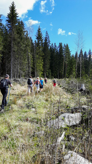 Kartasta oli kiva seurata joukolla maan pinnanmuodostuksia, kalliot, puronvarret, lammet, tiheiköt. Jylhien puiden huminaa oli pysähdyttävä kuuntelemaan. Tuleeko juna vai tuuleeko?