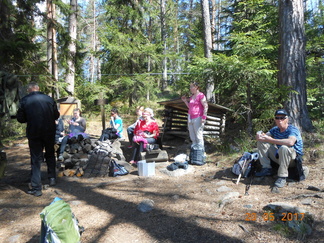 Suolijärven huussin mutkaan tullessa 3 ulkoilijaa päätti palata muiden kiireittensä vuoksi P-paikalle. Heille annettiin lupa tehdä se. Me muut laskeuduimme Suolijärven rantaan evästelemään. Siellä olikin yksi retkeilijä hammockissaan kirjaa lukien. Sanoisin, että hänellä oli aika ruhtinaalliset oltavat järvinäkymineen! Paidan kuivattelua ja taas matkaan.